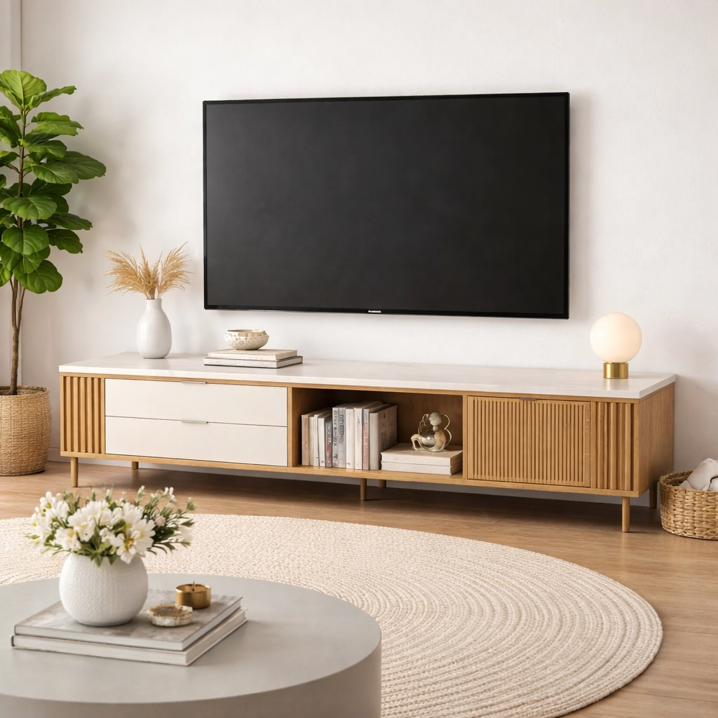 Meuble long avec compartiments ouverts et tiroirs parfait pour equipement multimedia design contemporain et fonctionnalite optimale salon organise